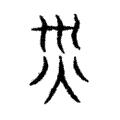 1.會意。甲骨文字形,象火焚屋的形狀。小篆從川,表水;從火。水火都是災禍之源。本義:火災。