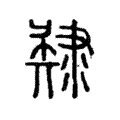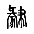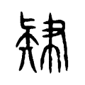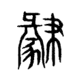 附注《說文新證》:「甲骨文从㣇(从『豸』,但頭部向後)、从又,㣇亦聲,會持手遏制豸獸,以解牲布陳之義。隸定當作『𫩁』。金文加『巾』或『巿』,隸定當作『』。」